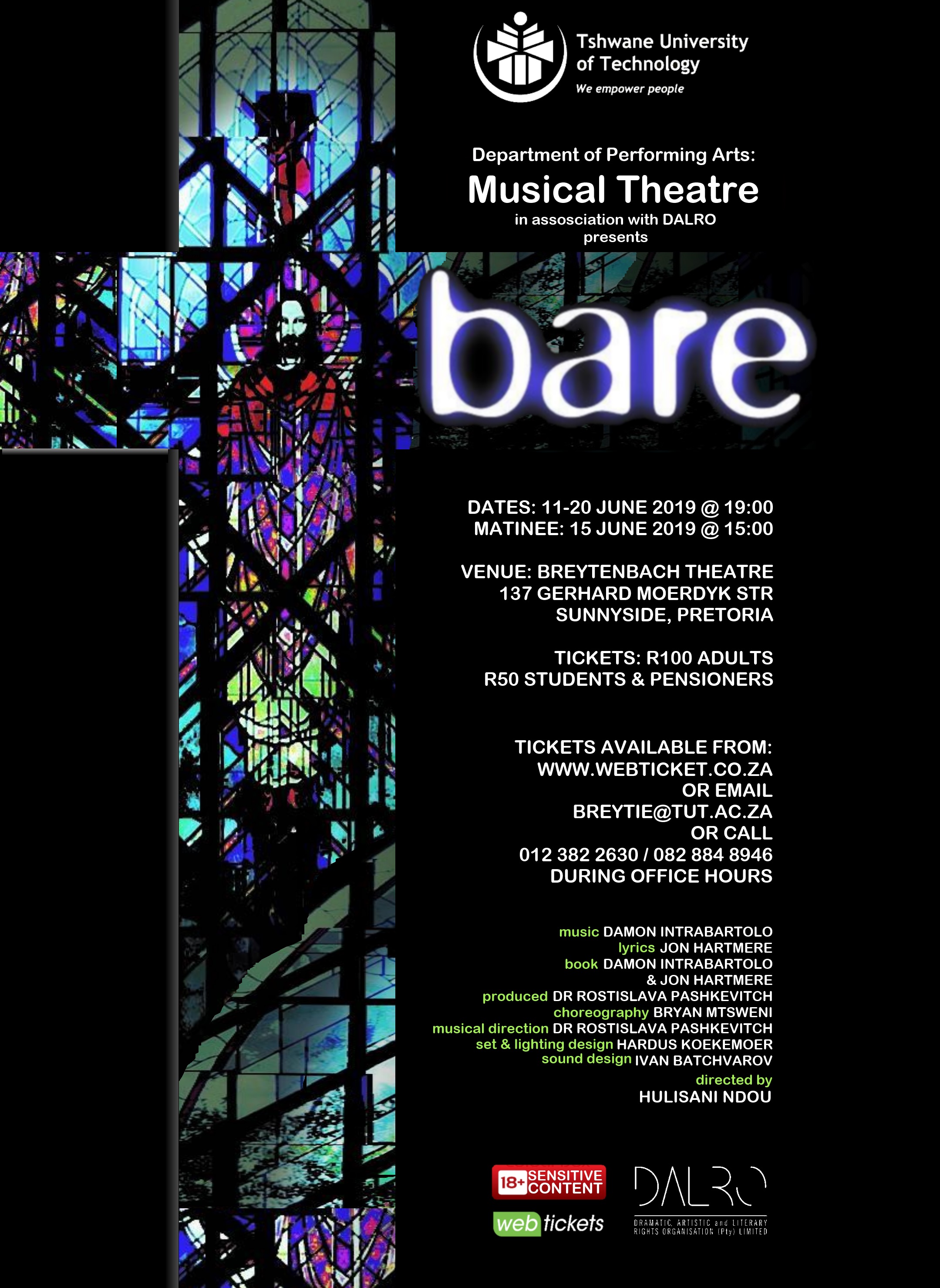 Presented by Tshwane University of Technology – Department of Performing Arts, Musical Theatre. Bare, a musical set to a pulsating rock score, is an electrifying story of a group of co-ed Catholic boarding school students navigating their way through teenage self-discovery while wrestling with identity, sexuality and religion.